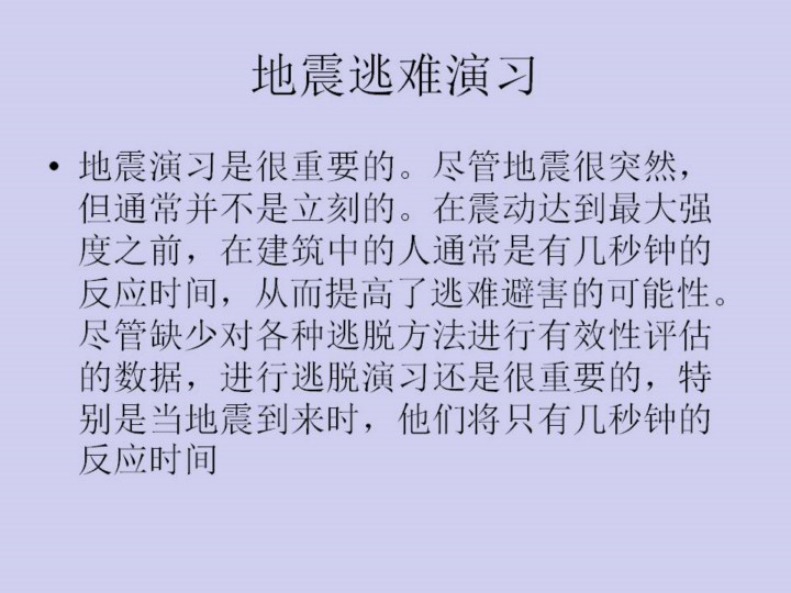 前震是进行逃生的最重要的警告。例如1979年在黑山发生的两次地震之间时间比较相对较长,使得人们有足够的时间逃脱。1980年地震研究显示那些能够立刻逃到空地的人受伤和死亡的可能性都比较小。然而,往室外跑对于乡村地区是有效的,但对于人口密集的城市地区,由于街道上可能被堆满了屋顶和墙壁的坠落物,因此街道并不能提供很好的保护;这个时候楼里的大厅则可能提供落脚地。1985年智利地震的研究显示很多人都是在试图逃跑的时候被屋顶的坠落物砸死的;在当地被推广的最流行的避难方法是基于童话故事的“鸭子和笼子”的方法,即人们躲在桌子和床底下 |