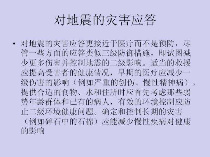 地震影响的早期快速评价 由于对被困受害者的快速救援和对那些有受到威胁生命的受伤者的及时治疗可以大大的提高他们的健康水平,早期快速的评价当前伤情是很必须的,可以帮助资源被合理调配到最需要的地方。不幸的是,那些可能引起大量伤亡的因素同样可能引起交通阻断和医疗设施的破坏。公共卫生机构需要提前建立一些调查受灾情况的方法。 |