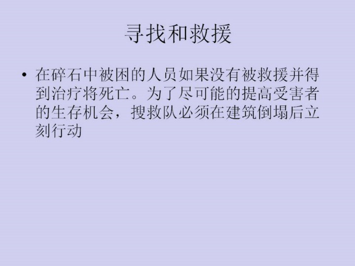 1980年意大利坎帕尼亚地震,1976年中国唐山地震,1988年美国地震以及1990年菲律宾地震都显示:随着被困时间的增长、获救的被困人数将减少。在意大利的地震中,一项对3619名获救者的调查显示:有93%的被困但存活者都在24小时之内获救,而95%的死亡都是发生在被困时期。在土耳其和中国,对被困在倒塌的建筑中的受害者进行的估计显示在被困的2到6小时内就已经有多一半的人死亡。尽管我们不知道这些被困的人是立刻死亡的还是在废墟中挣扎过一段时间,我们可以确定:越早实施搜救工作,救活的人越多。正如这些数据显示,即使有特殊的救援队伍,其成员包括救援专家、现场恢复和急救人员,如果他们在地震发生了几天之后才到来,那么对一个大地震的整体死亡率减少没有任何贡献。 |