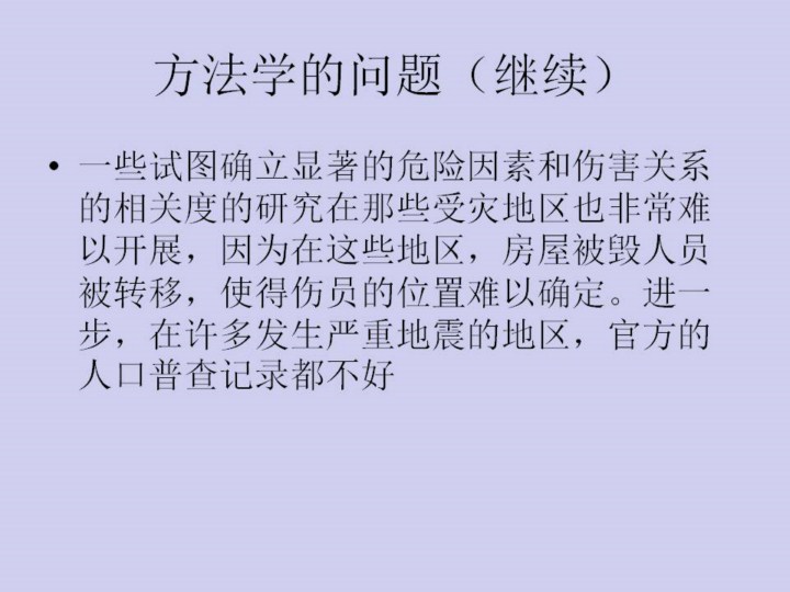 | 即使好的普查数据能够得到,例如在加利福尼亚州,其它一些因素,例如人口迁入和迁出的比例会很大程度的影响地震发生时当地的人口情况。因此,即使是估计受危人群都会是相当困难的一件事,更别说设立合理的对比人群。这也就是为什么大多数流行病研究都是描述性的而不是分析型的,而我们要测试我们对于某种类型的自然灾害和人为灾害因素(例如倒塌的建筑)与伤害的关系的假说,恰恰需要那种分析型的研究。