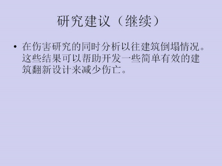 研究地震中伤亡相关的行为因素。只有掌握受伤者和未受伤者的准确位置信息,救灾的官员才能向楼房住户提供有用的建议,应当如何去做才能减少伤亡的可能性。 收集数据,使我们能够根据建筑类型,当地土壤状况,地震强度和人口密度预测伤员的情况。这些信息是非常重要的,可以帮助我们迅速估计出事态的严重性,可能得到的救助和卫生医疗服务方面的需要。(例如估测需要的物资和人员数)。 |
