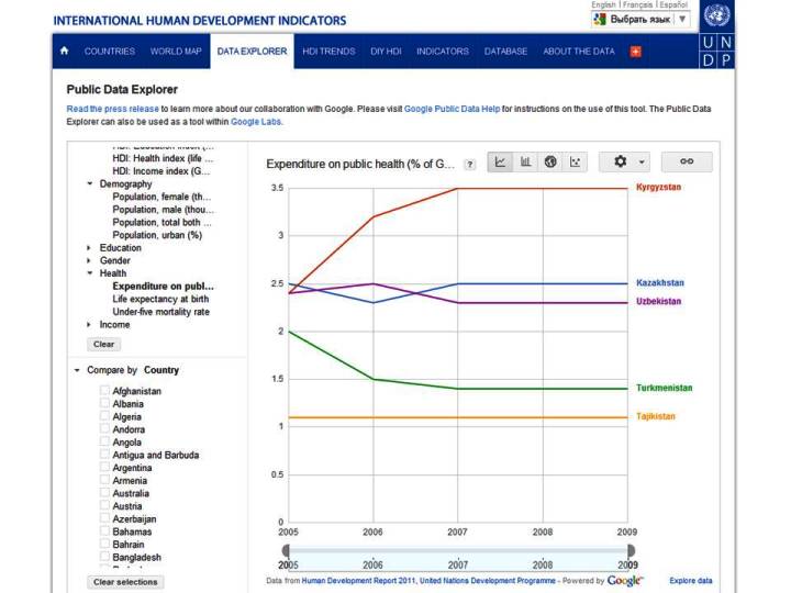 Expenditure on public health (% of GDP) Public health expenditure consists of current and capital spending from government (central and local) budgets, external borrowings and grants (including donations from international agencies and nongovernmental organizations), and social (or compulsory) health insurance funds. World Bank (2011). "World Development Indicators 2011." Washington, D.C.: World Bank. http://data.worldbank.org. Accessed May 15, 2011. http://hdr.undp.org/en/data/explorer/