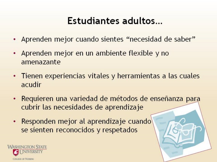 Algunas características básicas de los estudiantes adultos… 1. Tendencia a estar internamente motivados to be internally motivated 2. Usualmente sienten la necesidad de ser responsible de sus aprendizajes 3. Llevan experiencias al ambiente de aprendizaje 4. Aprenden mejor cuando nuevas experiencias están relacionadas a experiencias previas. 5. Necesidad de que las experiencias de aprendizaje sean percibidas como significativas. 6. Tendencia a orientada por problemas (orientada por aplicación) más que orientada al sujeto. 7. Necesidad de un ambiente informal/cómodo para foemntar el aprendizaje. 8. Aprenden mejor cuando la enseñanza es muti-sensorial 9. Las necesidades de aprendizaje necesita involucrar al estudiante. 10. Sensible, retroalimentaciòn fomenta el aprendizaje (necesita ser inmediata y los ayuda a evaluar el auto-progreso).
