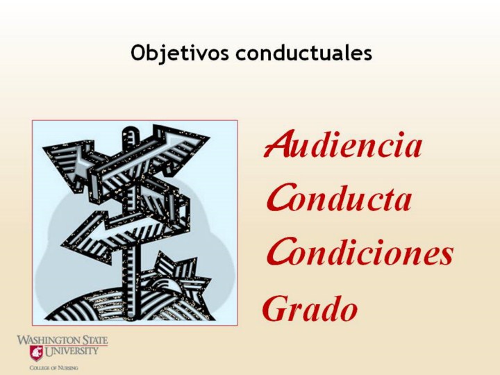 contenido. They are statements communicating instructional intent describing a proposed, observable, measurable change in a learner. Objectives also describe outcomes rather than a description or summary of the content. Audience- specifies who will perform the behavior Behavior- what the learner will do, know, feel, value or believe must be observable and measureable must be described using an action verb (i.e., choose, identify, pick, describe, match, assess, explain, compare, interpret, etc.) Conditions- where and/or when performance behavior will occur Degree- the standard or criterion for performance