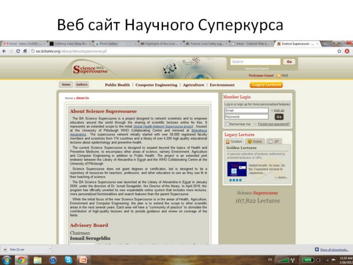 The project is an extended joint endeavor between the Library of Alexandria in Egypt and the WHO Collaborating Centre at the University of Pittsburgh. Launched in 2009, Science Supercourse has over 100,000 lectures.