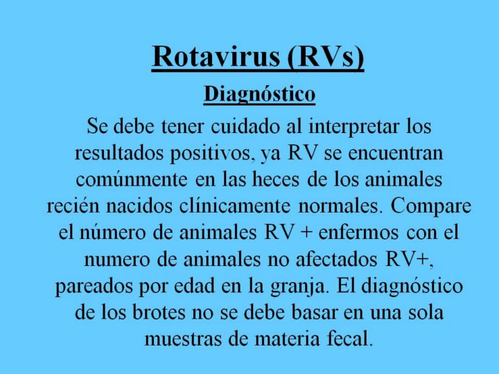 Métodos: en heces: ELISAs disponibles comercialmente para RV Grupo A. ELISAs para RV humano, bueno para RV animal. Aglutinación de látex: comercialmente disponible para grupo A; prueba en lateral de la pantorilla. Microcopía de electrones: RV tienen una morfología distintiva. Permite la visualización de otros virus enteropatogénicos, por ejemplo, coronavirus y calicivirus. PAGE (Electroforesis de gel de Poliacrilamida) de ácido nucleico viral segmentado: Usado en algunos Centros de Investigación Veterinaria. Patrones de banda distintivos. En tejidos: Inmunocitostáticos - permite correlacionar el daño intestinal y la infección por RV. Útil para animales de granja pequeños (cerdos); muestras de tejidos al inicio de la diarrea es esencial antes de perder los enterocitos infectados. Único animal puede ayudar al diagnóstico. Título creciente de anticuerpos: no de utilidad debido a que la mayoría de los animales tienen altos niveles de anticuerpos contra RV en el plasma. |
