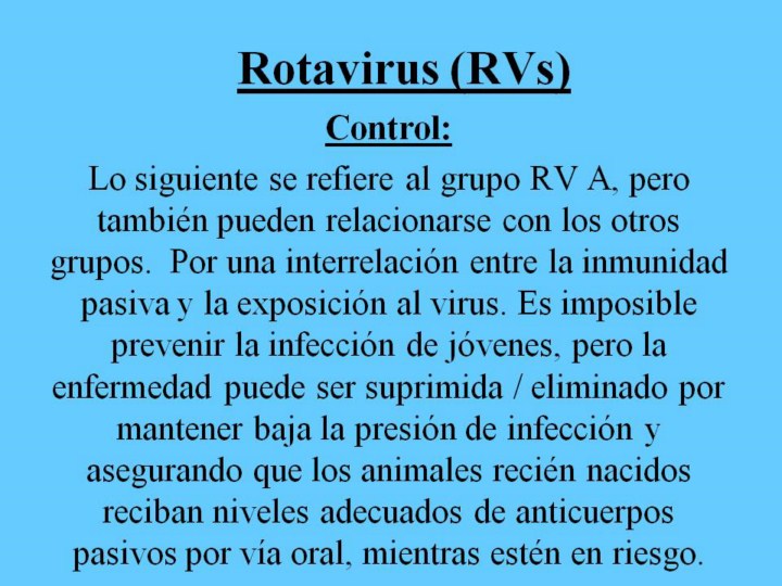Remover ropa de cama sucia, desinfectar las manos, guantes, botas, ropa después de tratar con los animales enfermos; manejar primero a los animales enfermos; limpiar con vapor / fumigar las instalaciones. Practica todo afuera/todo adentro cuando sea posible. Anticuerpo debe estar presentes en el lumen intestinal para neutralizar la infectividad del virus y esto requiere diaria alimentación de calostro. La enfermedad se produce cuando la inmunidad pasiva disminuye (ya sea natural o por el destete). Animales enfermos por lo general tienen buenos niveles de anticuerpos circulantes derivados de la ingestión temprana de anticuerpos maternos. Éstos no tienen un efecto protector debido a que la patogénesis se limita al intestino. RV bovino: Una vacuna está disponible en el Reino Unido para mejorar y prolongar la secreción de anticuerpos neutralizantes contra RV en el calostro / leche. Primariamente para los terneros o como almacén en el calostro de vacas vacunadas con que se puede alimentar a terneros. RV Porcino: No existe ninguna vacuna comercializada en el Reino Unido, el calostro bovino protegerá a los lechones. RV caninos y felinos: No hay vacunas. |