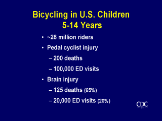 and 14, or about 28 million children, ride bicycles in the U.S. Unfortunately, this is not without risk. In 1998, about 200 such children die, and another 100,000 sustain a non-fatal injury requiring emergency department care. Of these, about 65% of the fatal injuries involve a head injury and 20% of the non-fatal injuries involve a head injury result in a brain injury.