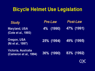 | Helmet use legislation is one of the most powerful tools to increase helmet use. Several studies have indicated that helmet use increases to almost 50% after a law has been passed, even in the absence of police enforcement. |