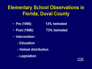 | However, a separate study spanned the adoption of the new law, and its findings were remarkably different. In Duval County, around Jacksonville, a 1996 observational study indicated that helmet use was 13% before, but 73% two years after a combined intervention. The post-intervention observations followed the adoption of the state law by about 16 months. |