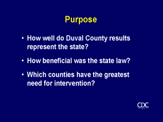 | We had three purposes in conducting this study. First, we sought to determine whether helmet use in Duval County was representative of the entire state. Second, we wanted to learn how beneficial was the state law for increasing helmet use. Third, we wanted to use these survey data to target the counties in greatest need for intervention. |