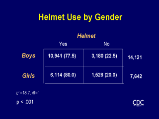 likely to wear helmets as boys. Here we see that, even though boys rode bicycles twice more frequently than girls, about 80% of both genders wore bicycle helmets. The very large sample size have made these values statistically, but not practically, significant. |