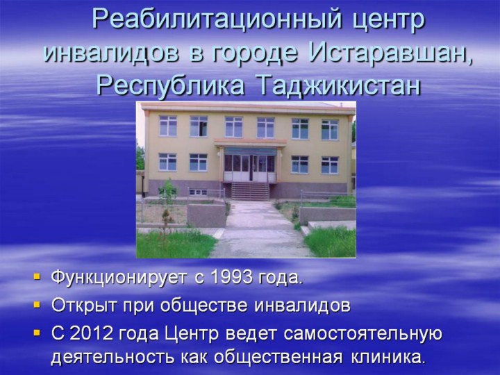 «Согласно последним данным, недавно опубликованным во Всемирном отчете по инвалидности (2011 World Report On Disability), порядка 15% мирового населения , то есть около 1 млрд. человек можно отнести к той или иной категории людей с ограниченными возможностями, как мы предпочитаем в ООН называть эту группу населения. При этом порядка 90-150 млн. человек из них - дети. Без сомнения инвалиды являются одними из основных контингентов, среди уязвимых групп населения и большинство из них попадает в категорию не просто малообеспеченных, а просто бедных или даже очень бедных людей. Правительство Таджикистана, предпринимает серьезные усилия по улучшению ситуации инвалидов, так в 2010 был принят новый закон о Социальной защищенности инвалидов, что является важным шагом в облегчении их положения, а также реализации их прав», по словам Координатора ООН и постоянного представителя ПРООН в РТ Александр Зуев - http://news.tj/ru/news/v-dushanbe-obsudili-voprosy-sotsialnoi-zashchity-i-prava-invalidov-v-kurgan-tyube-proveli-telem