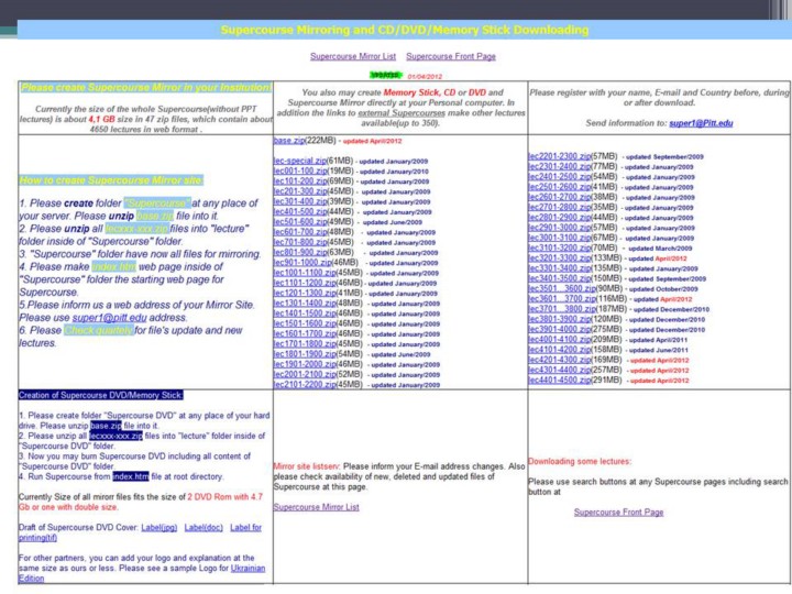 | http://www.pitt.edu/~super1/assist/download.htm Supercourse Mirroring and CD/DVD/Memory Stick/Personal computer Downloading