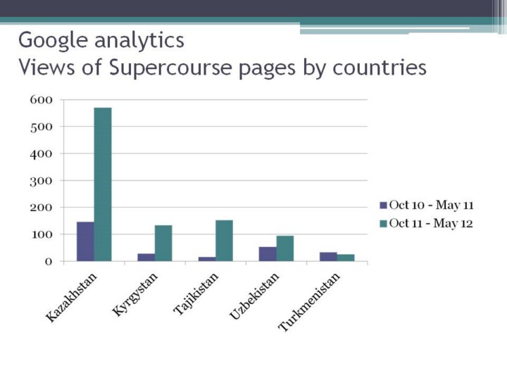 | Google analytics for Central Asia countries. There are some positive trends in viewing of Supercourse pages as front page, author page etc in comparison between 7 month in 2010-2011 year with 7 month in 2011-2012. As for period from Octorer 2011 to May 2012 we got most of Supercourse page visits as well lectures visits during January and February with some decreasing in last month.