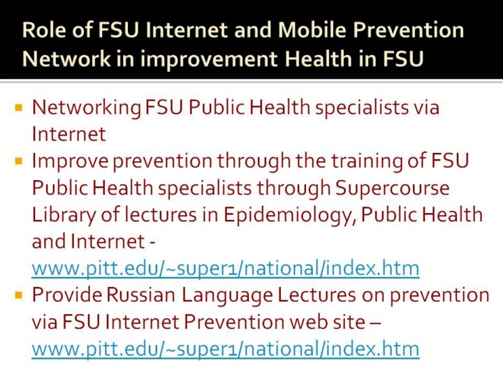 Our FSU Supercourse is a backbone for Mobile health Project in FSU countries. Our mission is to double training in global health and prevention in the next 2 years. |