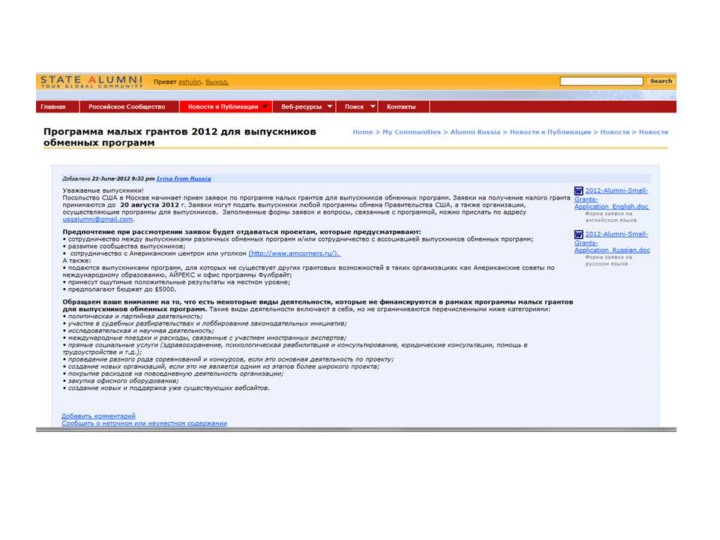 There is possibility for small grant applications through the State Alumni Program https://alumni.state.gov/russia/news/alumninews/alumni-news/%D0%BF%D1%80%D0%BE%D0%B3%D1%80%D0%B0%D0%BC%D0%BC%D0%B0-%D0%BC%D0%B0%D0%BB%D1%8B%D1%85-%D0%B3%D1%80%D0%B0%D0%BD%D1%82%D0%BE%D0%B2-2012-%D0%B4%D0%BB%D1%8F-%D0%B2%D1%8B%D0%BF%D1%83%D1%81%D0%BA%D0%BD%D0%B8%D0%BA%D0%BE%D0%B2-%D0%BE%D0%B1%D0%BC%D0%B5%D0%BD%D0%BD%D1%8B%D1%85-%D0%BF%D1%80%D0%BE%D0%B3%D1%80%D0%B0%D0%BC%D0%BC