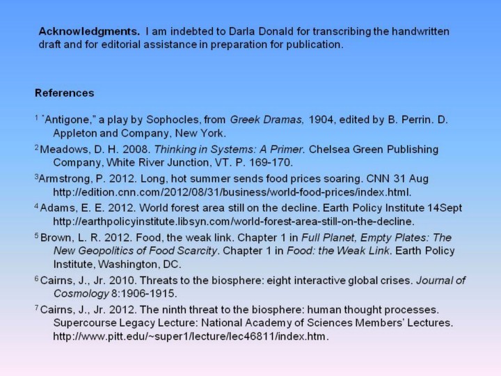 global crises. Journal of Cosmology 8:1906-1915. 7 Cairns, J., Jr. 2012. The ninth threat to the biosphere: human thought processes. Supercourse Legacy Lecture: National Academy of Sciences Members’ Lectures. http://www.pitt.edu/~super1/lecture/lec46811/index.htm |
