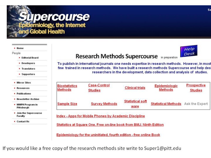 Help your self: One stop shop for Research Methods free books, apps, youtube presentations. Also >500 research methods Powerpoint lectures many translated into languages other than English