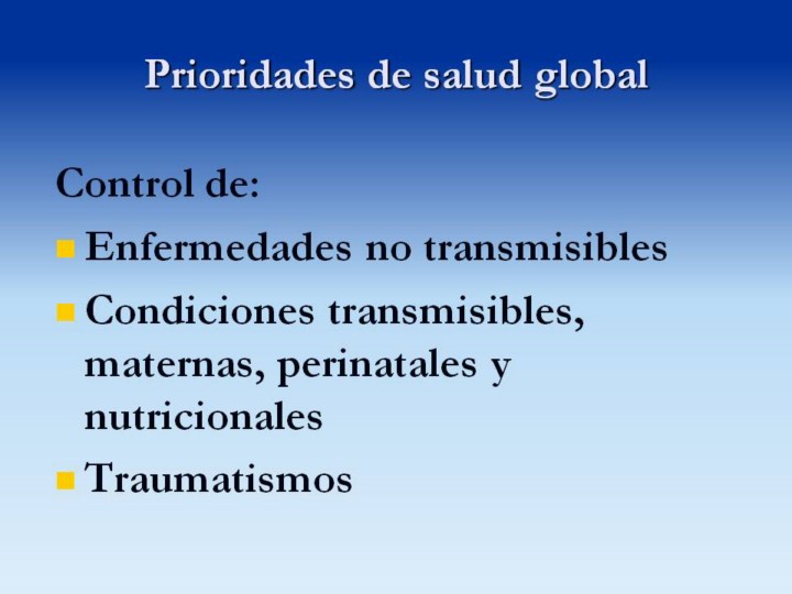 ¿Cuales son los temas más importantes en salud global actualmente? La publicación de 1996, “La Carga Global de la enfermedad”, presentó datos de 1990 con proyecciones al 2020 en tres grupos de causas de problemas de salud, que, colectivamente, constituyen la carga total de la enfermedad en el mundo. Estos son: Grupo 1, condiciones transmisibles, maternas, perinatales y nutricionales; Grupo 2, enfermedades no transmisibles; Grupo, traumatismos. Dentro de cada grupo hay condiciones específicas.