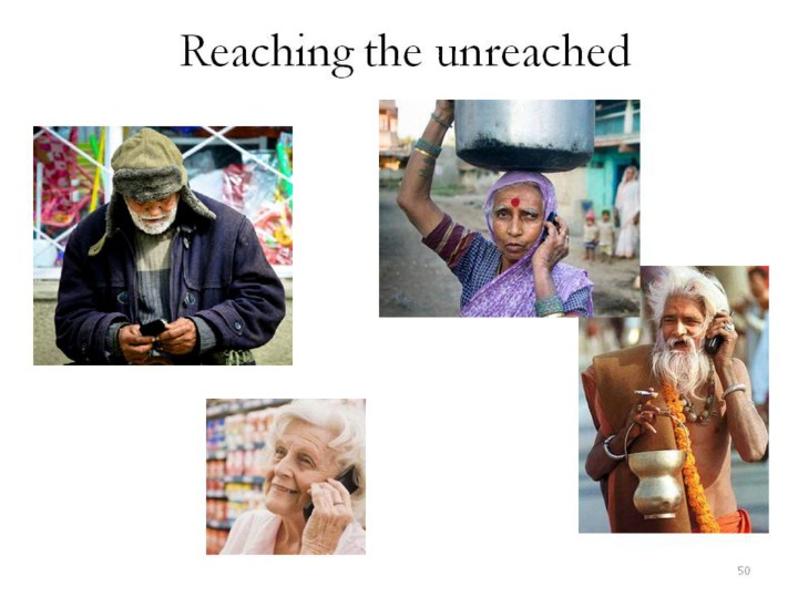 We have to reach the unreached and we are. About 50% of the homeless in the US has a cell. The cells have reached aborigines in the outback of Australia. Rural women in India have ready access, as do the elderly.