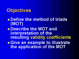 The method of triads is a technique for estimating the correlation between an observed measure of exposure and the true, but unknown, exposure value. The correlation in this case is referred to as the validity coefficient (VC). This technique was first applied by Dr. Rudolph Kaaks for use in validation studies in nutritional epidemiology. Application of the method of triads requires at least 3 measurements of the same exposure and assumes that all the 3 measurements are linearly related to the true exposure (T). First, we will briefly refer to continuous exposures and the associated measurement error.