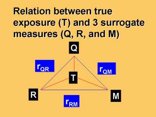 rRM. The correlation between T and each of the surrogate methods (Q or R or M) is referred to as the validity coefficient (VC). If all the 3 methods were relatively valid we would expect the correlations (VC) between each of the methods (Q, R, and M) and the true exposure to be about equal. This is the basis for the use of VCs in validating exposure measurements. Use of the VC instead of a simple correlation is of advantage because the VC reduces the likelihood of over/underestimation of the true correlation, if two of the surrogate methods were correlated or if repeated measurements from any of the methods were correlated. |