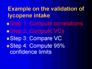 (M). Questions: Are the 3 methods equally valid? Is the FFQ measurement fairly reproducible? The pair-wise correlations (rounded-off to 2 dec. points) are as follows: For the FFQ and recalls: rQR = 0.37; or using Q2, rQR = 0.40; For the FFQ and biomarker: rQM = 0.24 or using Q2, rQM = 0.18. For the recalls and biomarker: rRM = 0.45. The VCs (and bootstrap confidence intervals) follow: