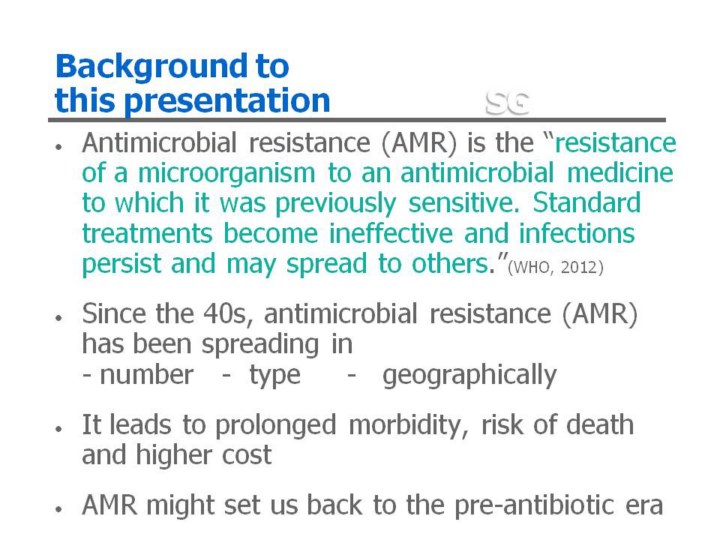 | Background: Antimicrobial resistance (AMR) is a worldwide problem arising from the use of antibiotics in people, animals and plants. The survival of resistant strains can spread from an individual to the community. AMR began with the invention of antibiotics in the 1940s. If antimicrobial resistance persists it can set us back to the pre-antibiotic era. This presentation will describe the extent of the problem in different countries, the contributing factors to AMR and the action taken. Which strategies and policies would decrease and slow down AMR?