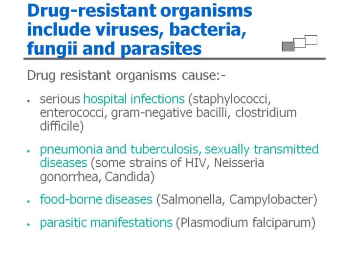 | Drug-resistant organisms include all major agents causing diseases such as viruses, bacteria, fungi and parasites. Bacteria such as staphylococci, enterococci, gram-negative bacilli, clostridium difficile cause serious hospital infections. Methicillin-resistant Staphylococcus Aureus (MRSA) causes serious hospital infections around the world. Respiratory diseases such as pneumonia and tuberculosis Food borne pathogens such as salmonella, camphylobacter Sexually transmitted organisms such as some strains of HIV, neisseria gonorrhoeae, candida and other fungi Parasitic manifestations such as plasmodium falciparium