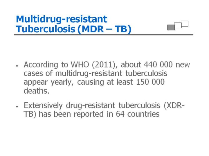 Multidrug-resistant TB (MDR-TB) is caused by organisms that are resistant to isoniazid and rifampicin. MDR-TB results from either infection with organisms which are already drug-resistant or become resistant during therapy. Extensively drug-resistant TB (XDR-TB) is a form of TB caused by organisms that are resistant to isoniazid and rifampicin or any of the second-line anti-TB injectable drugs amikacin, kanamycin or capreomycin. |