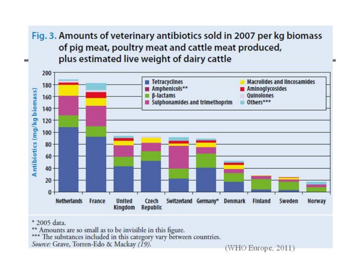 Exposure to antibiotics is high in animals – during most of their lifespan - especially in countries, where antibiotic growth promoters (AGP) are used. In Scandinavian countries, where policies are restricting antibiotic use, antibiotic usage in food animal production is more limited than in other countries such as the Netherlands and France. |