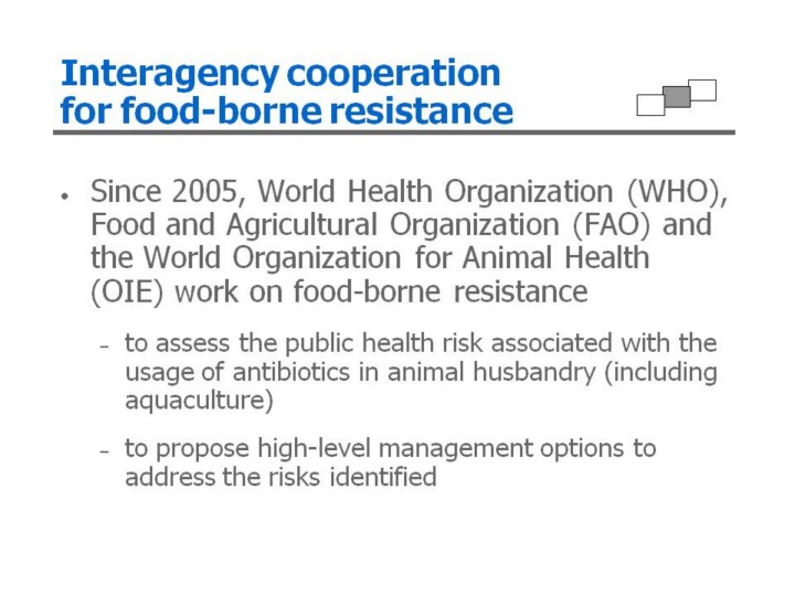 | The following strategies and guidelines were developed by the WHO, FAO and OIE: WHO Global Strategy for Containment of Antimicrobial Resistance WHO, Global Principles for the Containment of Antimicrobial Resistance in Animals Intended for Food World Organization for Animal Health (OIE) developed guidelines on the prudent use of antibiotics in food animals