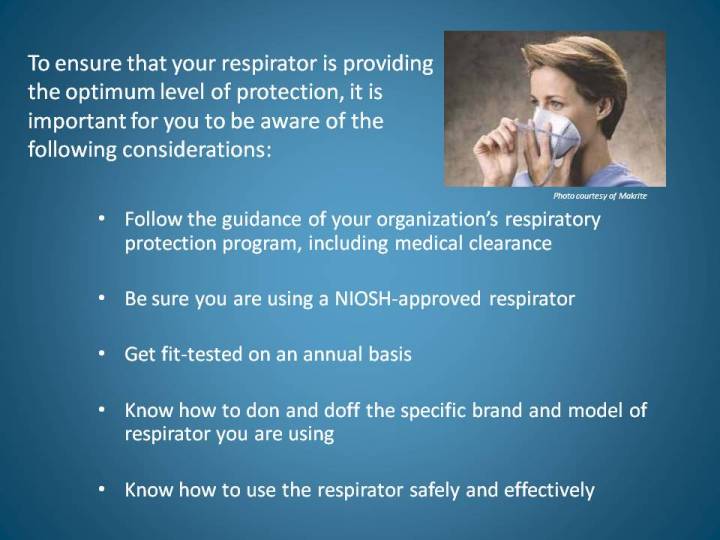 One of the occupational hazards in the healthcare setting is the airborne transmission of certain infectious diseases. The potential of exposure is not limited to physicians, nurses, and support personnel in direct patient care. It extends to those delivering food, cleaning patient rooms, and performing maintenance. Anyone working in areas with patients infected with airborne-transmissible diseases is potentially at risk. Wearing appropriate respiratory protection when necessary is a vital line of defense. In healthcare, the N95 filtering facepiece respirator is the most commonly used. Employers and employees need to follow safety and health standards established by Occupational Safety and Health Administration (OSHA), the Joint Commission, the Food and Drug Administration (FDA), the Centers for Medicare and Medicaid, and other organizations. Donning is properly putting the respirator on your face. Doffing is properly taking the respirator off your face.
