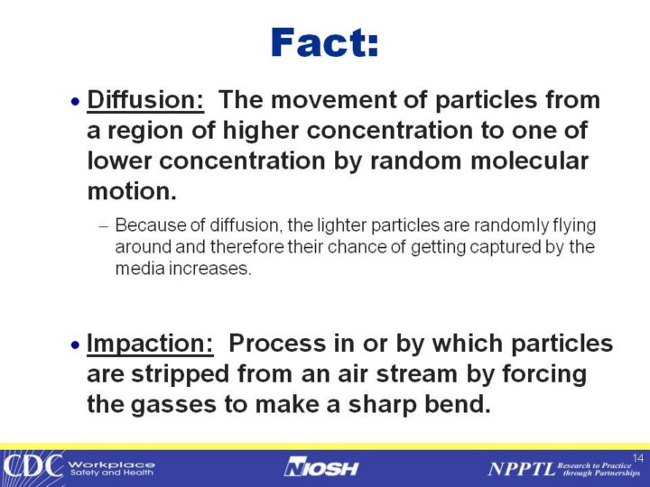| Myth: Smaller particles aren't captured by respirator filters. Fact: Common sense seems to indicate that a respirator filter acts like a screen. If one puts a bunch of dirt on a screen and shakes it out, the result is that the bigger chucks/particles of dirt are caught on top of the screen while the smaller ones fall through. Though this may be the case for larger particles, this screen theory doesn't hold true for the smaller particles when it comes to a filtering facepiece respirator. When smaller particles enter the filter area, they end up moving in a random motion and bouncing about - causing the particles to get caught in the filter medium. Impaction refers to the process when the larger particles actually collide, or make impact, with the filter media and become trapped. Diffusion refers to the process when the particles break apart and move in a random pattern, becoming caught in the filter media. So the smaller particles don't break through as easily as one might think that they would.