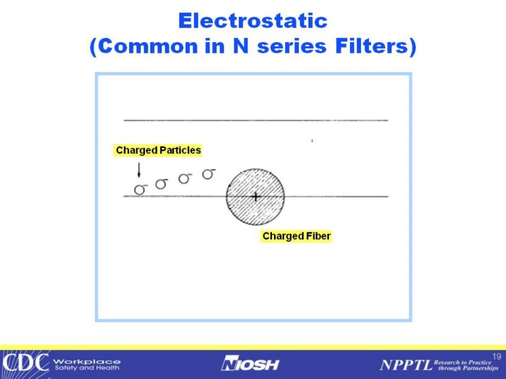 | Electrostatic: This is a mechanism applicable to all sizes of particles. Generally, N filters, such as the N95 respirator, are electromagnetically charged. Some filters are positively charged and some filters are negatively charged. When a charged particle comes through the filter, it is attracted to the opposite charge and it is captured by the filter medium. This method generally enhances the capabilities of the other, previously discussed mechanisms.
