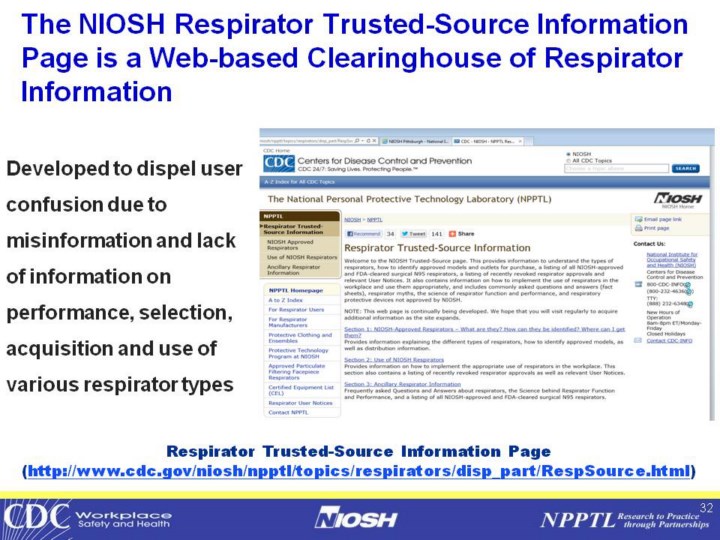 | Myth: If it says NIOSH-Approved on the box, I can trust this respirator. There's no other way to easily verify. Fact: The NIOSH Trusted-Source webpage was developed to dispel user confusion due to misinformation and lack of information on performance, selection, acquisition and use of various types of filtering facepiece respirators. Objectives: - Responsive to identified need of healthcare workers due to 2009 H1N1 - Provides basic information for respirator selection and use - Consists of repackaged existing respirator information - Generic information presentation format - Provides single-source resource for respirator information from informing novice to experienced users - Addresses availability of product for hazard-specific needs Respirator Trusted-Source Information Page (http://www.cdc.gov/niosh/npptl/topics/respirators/disp_part/RespSource.html)