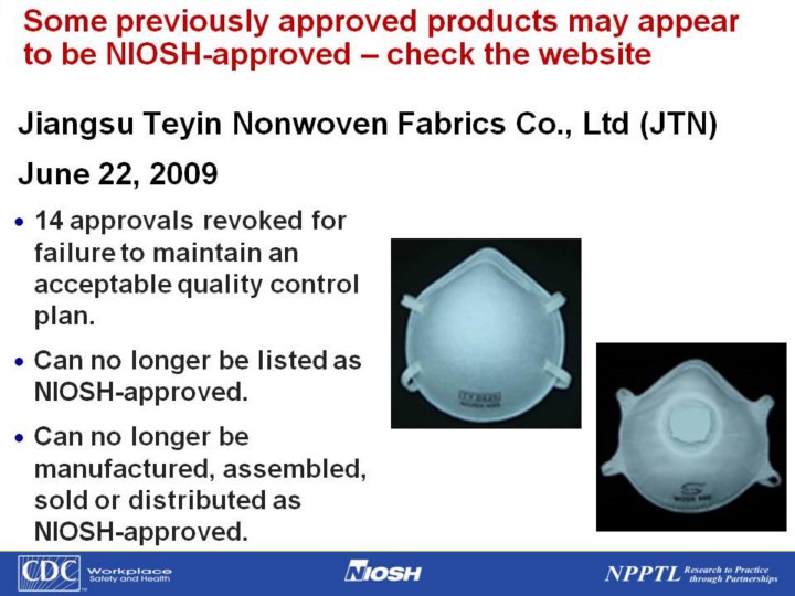 | To be sure that a respirator is currently approved by NIOSH, please see: http://www.cdc.gov/niosh/npptl/topics/respirators/disp_part/RespSource.html A list of NIOSH-approved N95 respirators is located on this web page and updated on a monthly basis. Donning instructions are also listed alongside of the approved product models.