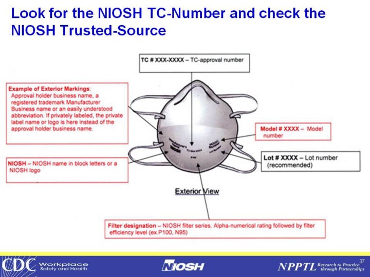 | This slide shows how an N95 respirator is identified and marked in accordance to NIOSH requirements for the approval. These markings include: - The Manufacturer's Name - The NIOSH Logo - The Filter designation - The term "N95", is both the name of the type of respirator as well as the filter type designation. Other examples include P100, N100 ect. - The Lot Number is not required, but strongly recommended - The Model number is the name by which the product is advertised by the manufacturer - The TC number is the NIOSH approval number designating an N95 respirator as an approved product in NIOSH records