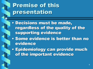 The premise of this presentation is that epidemiology can help to produce better policy, and ultimately better population health. It can do this through contributing to policy analysis : the process of predicting the impacts of possible policies and evaluating past policies (there are much more complicated definitions). As the discipline that deals with the distribution and determinants of health-related events in populations, epidemiology can make a major contribution to policy analysis. |