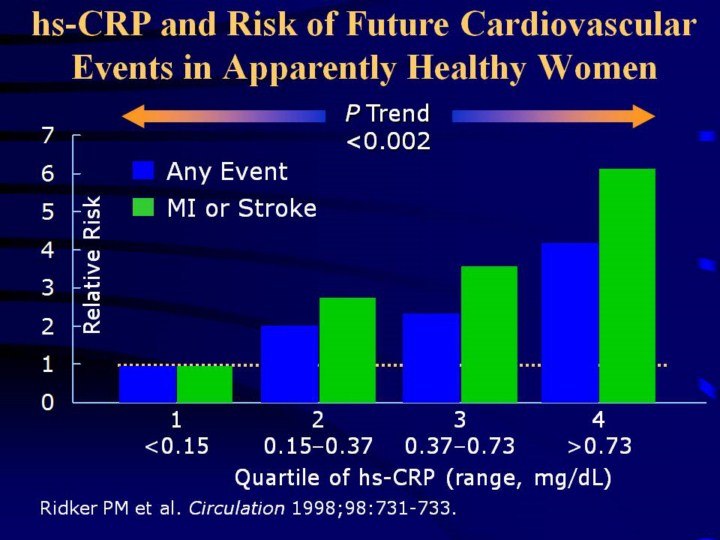 Reference: Ridker PM, Buring JE, Shih J, Matias M, Hennekens CH. Prospective study of C-reactive protein and the risk of future cardiovascular events among apparently healthy women. Circulation 1998;98:731-733.