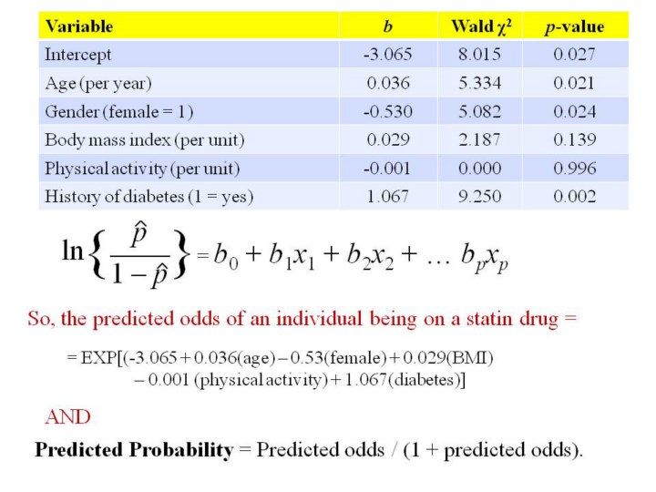 1. Continuing with this example, we can calculate the predicted probability for a given individual being on a statin drug by dividing the predicted odds by (1 + the predicted odds). |