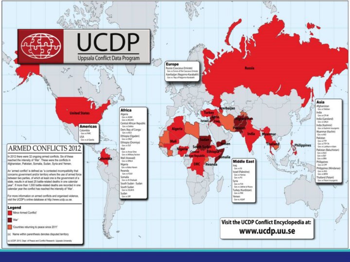 This is a map of conflicts around the world: http://uppsalaconflictdataprogram.files.wordpress.com/2013/09/armedconflicts_2012.jpg
