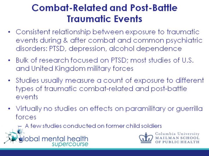 Betancourt, T. S., Newnham, E. A., McBain, R., & Brennan, R. T. (2013). Post-traumatic stress symptoms among former child soldiers in Sierra Leone: follow-up study. The British Journal of Psychiatry, 203(3), 196-202. A study in war affected Sierra Leone found that among child soldiers (average age 16.6), 36% endorsed having injured or killing someone and 32% met the criteria for PTSD. War experiences were a significant predictor of increased PTSD. (Betancourt, 2013)