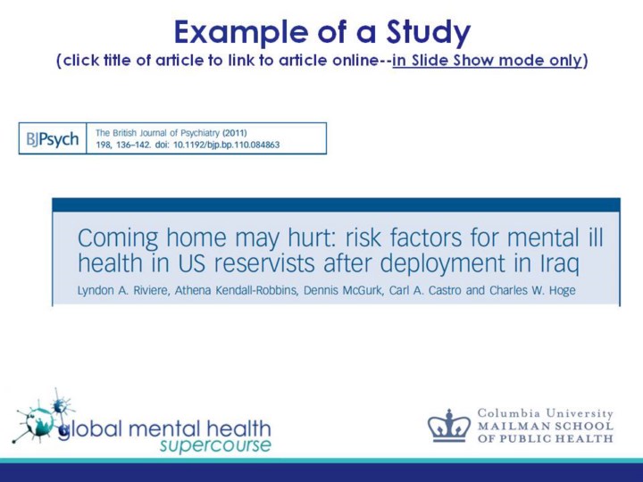 Riviere, L. A., Kendall-Robbins, A., McGurk, D., Castro, C. A., & Hoge, C. W. (2011). Coming home may hurt: risk factors for mental ill health in US reservists after deployment in Iraq. The British Journal of Psychiatry, 198(2), 136-142. http://www.ncbi.nlm.nih.gov/pubmed/21282784
