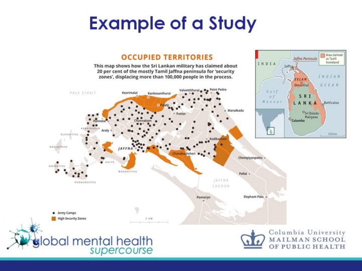 Husain, F., Anderson, M., Cardozo, B. L., Becknell, K., Blanton, C., Araki, D., & Vithana, E. K. (2011). Prevalence of war-related mental health conditions and association with displacement status in postwar Jaffna District, Sri Lanka. JAMA, 306(5), 522-531.