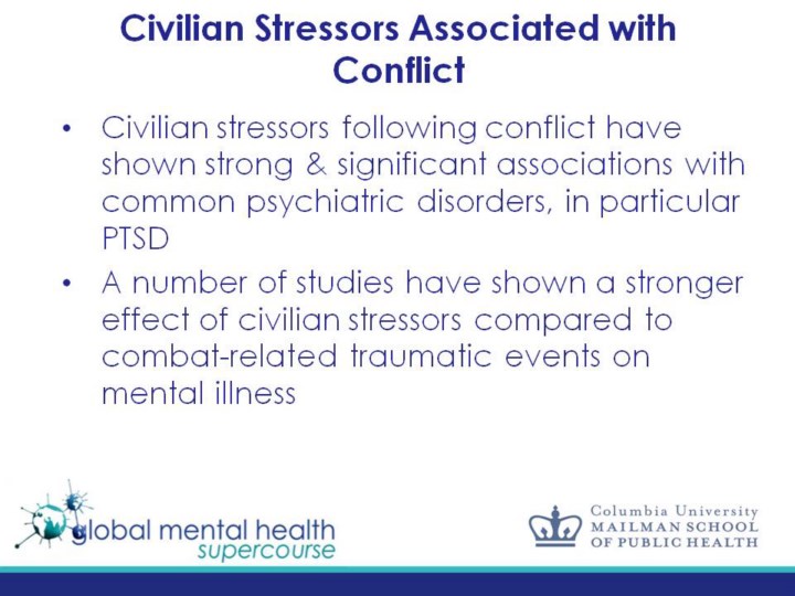 Daily stressors are associated with mental illness because they are more proximal than combat-related related traumas, they are mainly out of the individuals control, and daily stressors are more ubiquitous among conflict-affected populations.