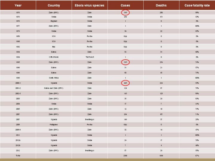 Confirmed cases/outbreaks of Ebola virus disease to 2012