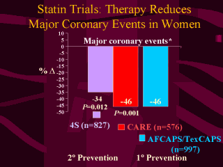 | n = number of women enrolled. *4S = primarily CHD death and nonfatal MI; CARE = coronary death, nonfatal MI, angioplasty, or bypass surgery; AFCAPS/TexCAPS = fatal/nonfatal MI, unstable angina, or sudden cardiac death. Miettinen TA et al. Circulation. 1997;96:4211-4218. |
