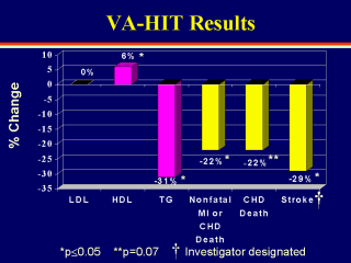 The Veteran Affairs Administration HDL Intervention Trial (VA-HIT) was the first study to examine whether lipid therapy reduces the combined incidences of CAD death and nonfatal MI in men with established CAD who have low levels of HDL with “desirable” levels of LDL. This landmark study provides the first definitive proof that raising HDL reduces the risk of coronary and cerebrovascular events. |